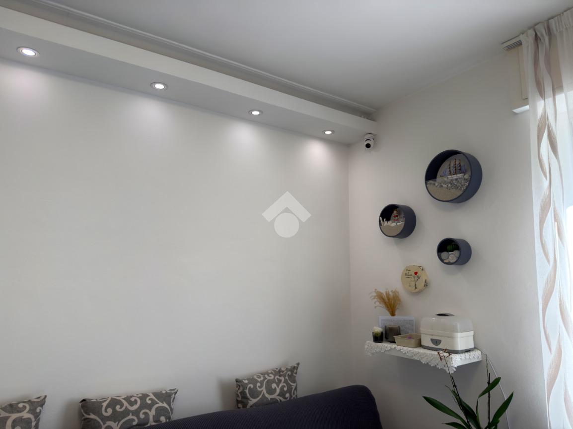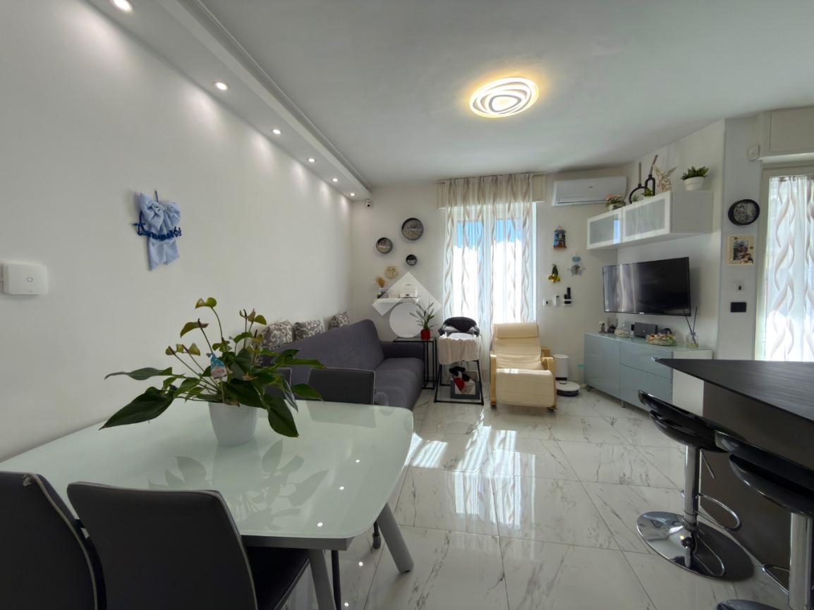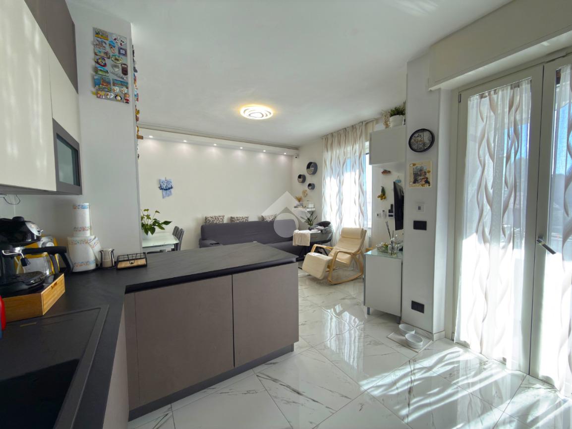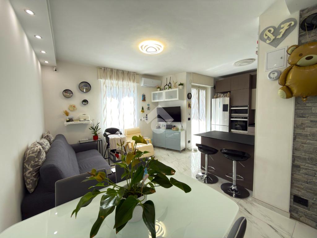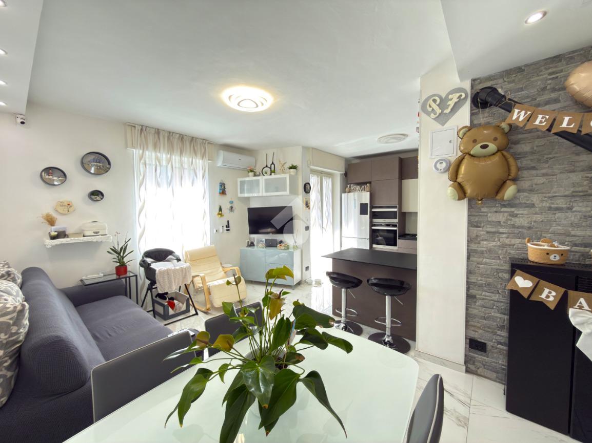 L'immobile è situato al primo piano ed è composto dall'ingresso living in soggiorno con cucina a vista e uscita sul balcone, il disimpegno, una camera da letto con balcone, il bagno con doccia ed una seconda camera da letto con balcone.