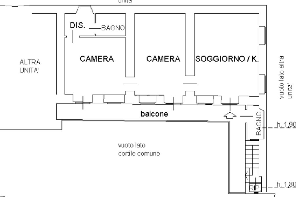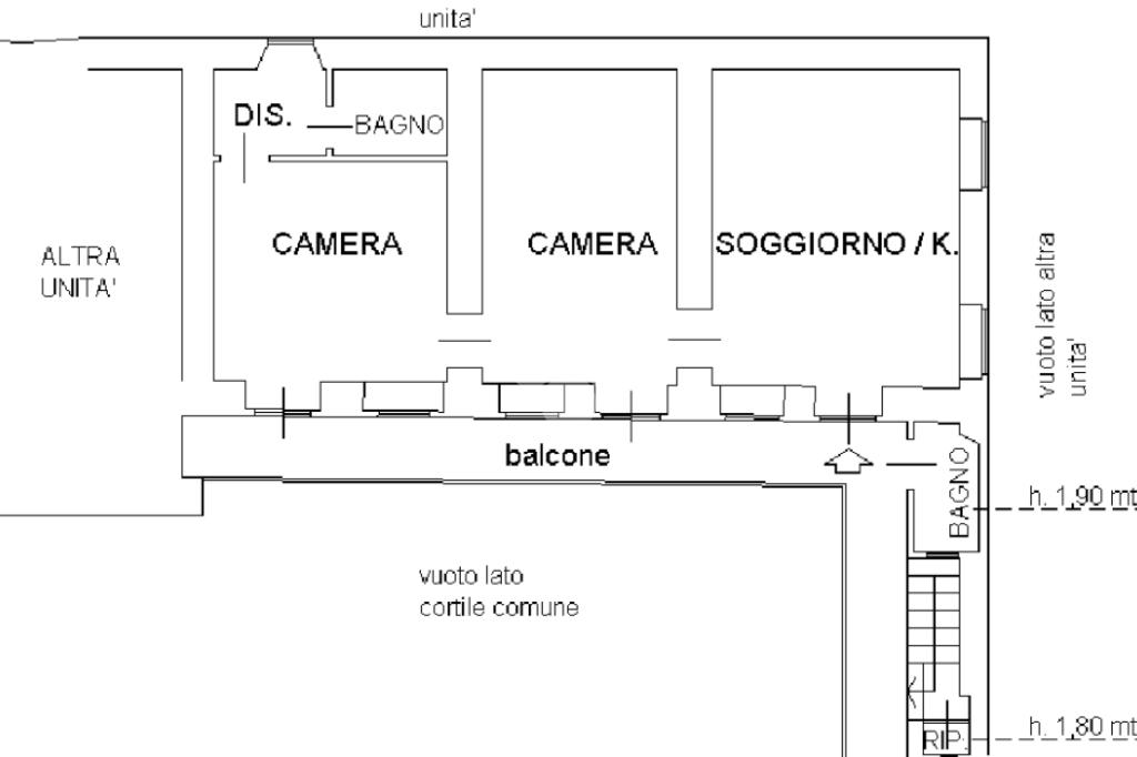 Si compone di tre locali di cui un soggiorno living con angolo cottura, una prima camera, una seconda camera con bagno finestrato e vi è inoltre un locale lavanderia esterno.