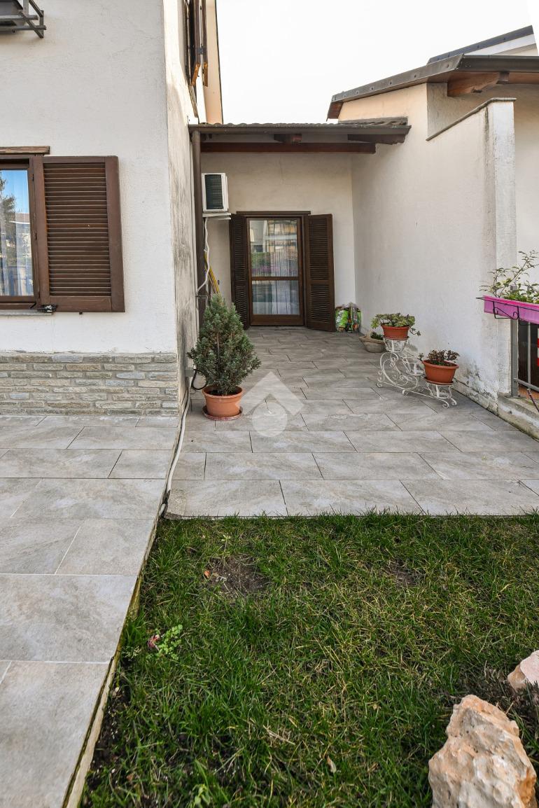 Il posto auto coperto situato al piano terreno e l'ampio giardino di proprietà completano la soluzione.